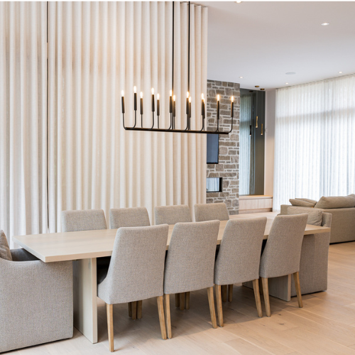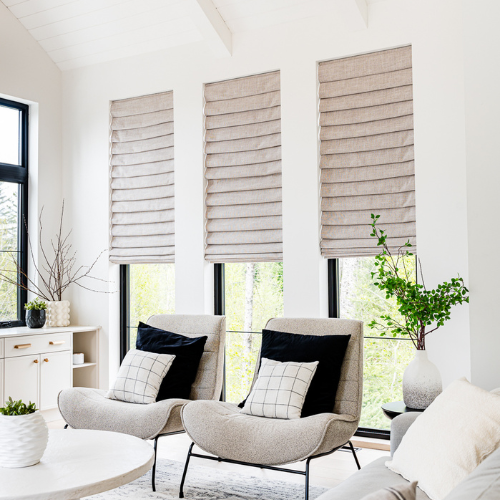 We specialize in custom window treatments. We have layered shades, solar shades, translucent shades, blackout shades, Roman shades, custom wall-to-wall sheers, and custom curtains in several styles such as Ripplefold, Euro Pleat, French Pleat and Grommets. We also have motorization available for most of our products.