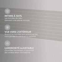 Intime à 100 % lorsque les bandes sont alignées, elle laisse entrer une douce lumière et permet de voir vers l’extérieur lorsqu’elles sont décalées. Elle se remonte complètement pour libérer la fenêtre.